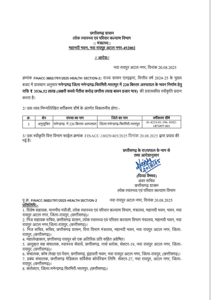 मनेंद्रगढ़-चिरमिरी-भरतपुर जिले को बड़ी सौगात मिली है। छत्तीसगढ़ की भाजपा सरकार ने 220 बिस्तर वाले आधुनिक अस्पताल के निर्माण की स्वीकृति दे दी है। इस परियोजना पर 35 करोड़ 36 लाख 52 हजार रुपये खर्च होंगे।