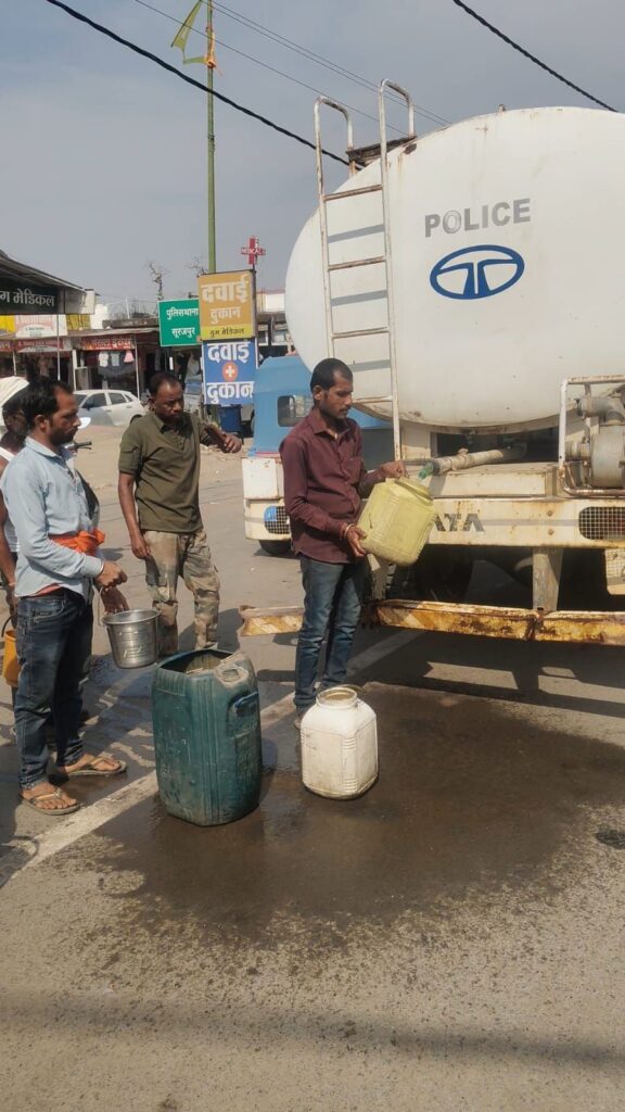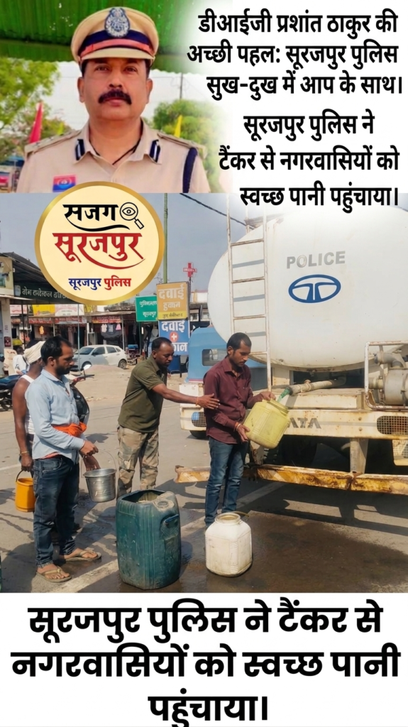 सूरजपुर | “पुलिस हर कदम आपके साथ, आपकी रक्षा और सुरक्षा के लिए तत्पर”—इस ध्येय वाक्य को सूरजपुर पुलिस ने एक बार फिर चरितार्थ कर दिखाया है। जहाँ एक ओर पारा चढ़ने से लोग भीषण गर्मी से बेहाल हैं, वहीं तकनीकी कारणों से नगर की जल आपूर्ति ठप्प होने पर पुलिस ने ‘राहत की फुहार’ बनकर मोर्चा संभाला।