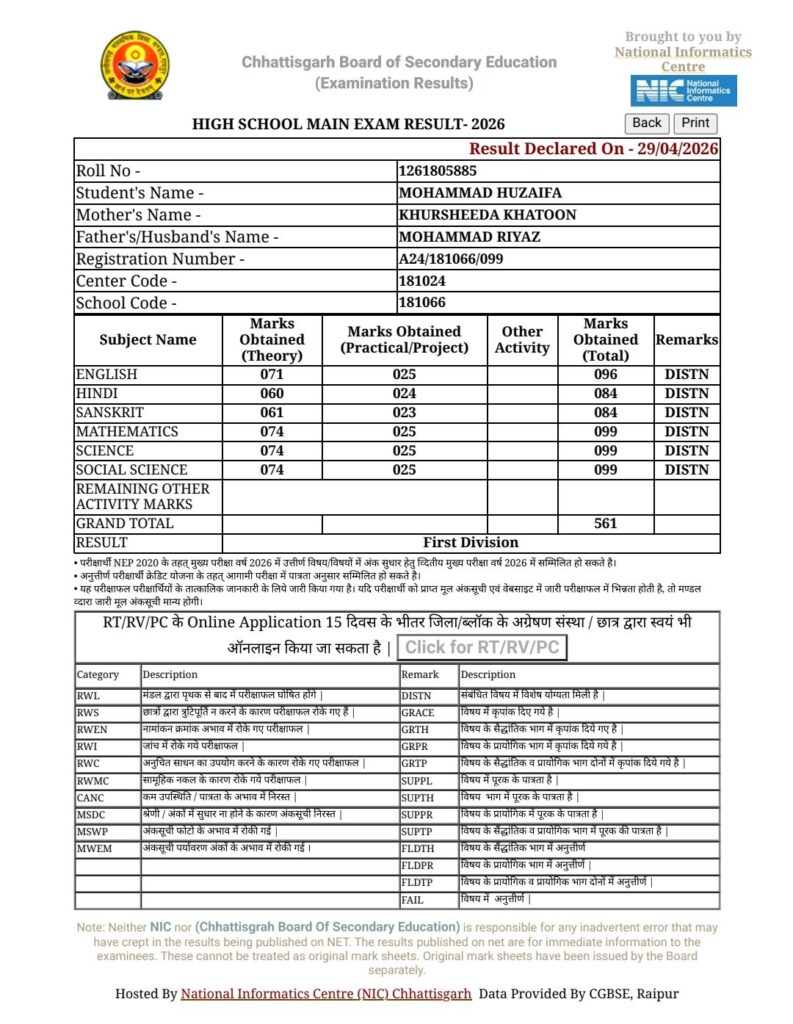 छत्तीसगढ़ माध्यमिक शिक्षा मंडल (CGBSE) द्वारा मंगलवार, 29 अप्रैल 2026 को घोषित 10वीं की मुख्य परीक्षा के परिणामों में मनेंद्रगढ़-चिरमिरी-भरतपुर जिले के मोहम्मद हुजैफा ने अपनी प्रतिभा का लोहा मनवाया है। वेस्ट चिरमिरी पोड़ी के निवासी मोहम्मद रियाज और खुर्शीदा खातून के सुपुत्र हुजैफा ने 600 में से 561 अंक (93.5%) प्राप्त कर शानदार उपलब्धि हासिल की है।